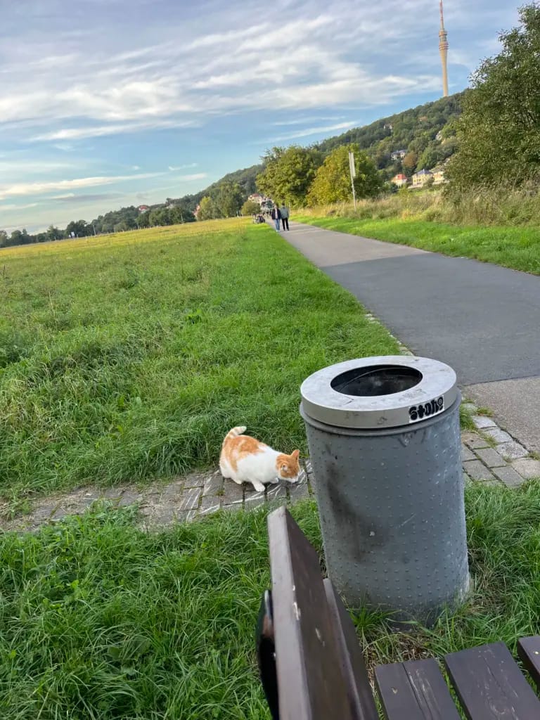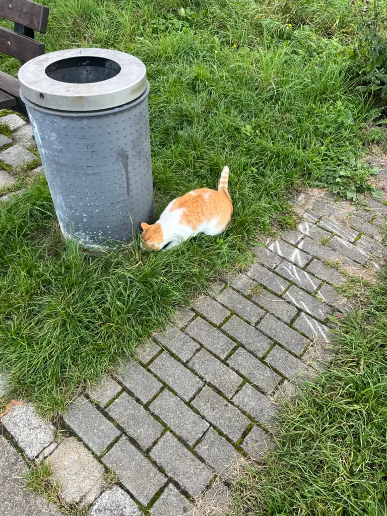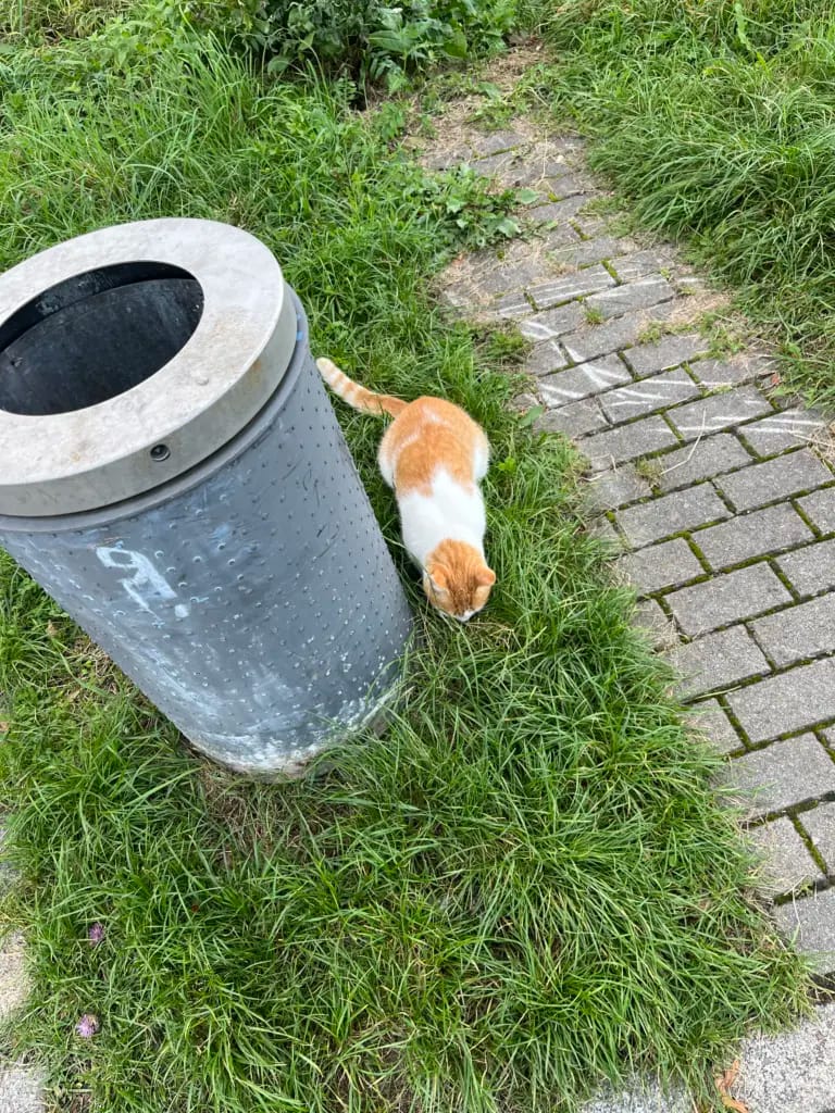 Nun gräbt Mietze die Tonne aus. Da ist sie wieder, ihre Maus!
